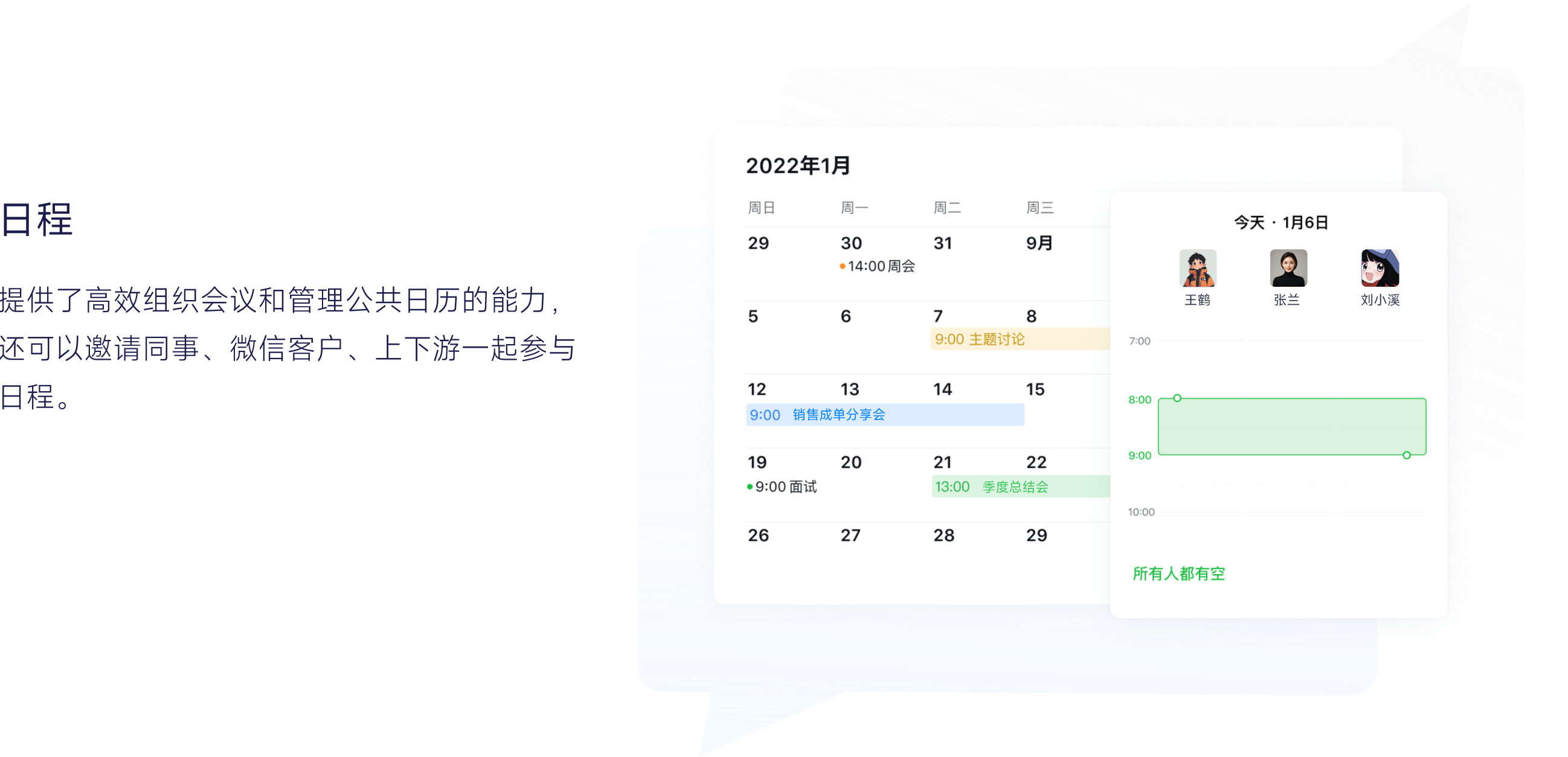 在会议室接洽,一键通知参会人,并合理管理。管理员可灵活设置会议室预约规则,资源利用率高效。